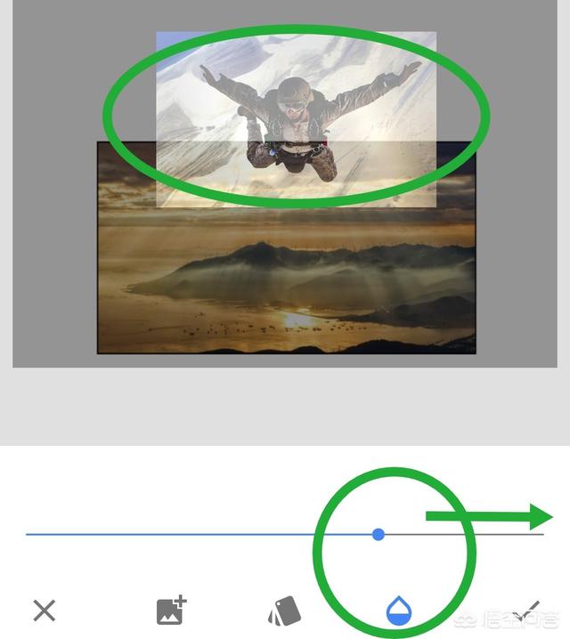 5、把人像照片移动到上方边缘部分,让人像的一部分在相框内,一部分在相框外,改变为比例合适的大小。调整好之后,点击水滴,把水滴圆点拽到最右端,让后添加的人像照片变成不透明就对了。点击右下角保存此步。