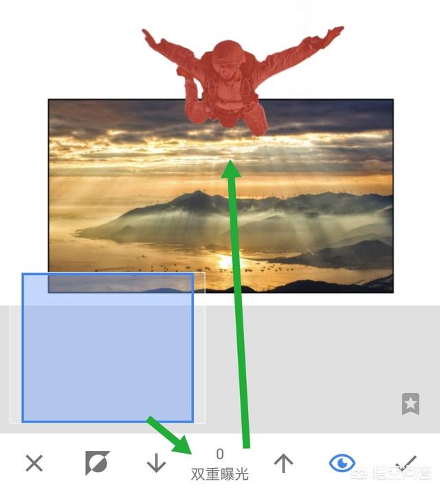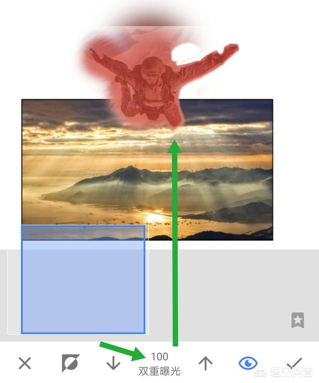 7、点击画笔后,把图片下方双重曝光数值调为100,对刚才添加照片的地方,进行涂抹,让想完全显示出来。