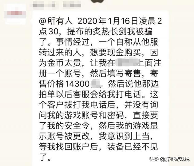 出了提布,玩家们自然欣喜若狂,既然团长表示找大老板,其他玩家再欢快的气氛下也没有过多的质疑,然而第二天该团长在公会群中发的消息却给所有公会团成员来了一个晴天霹雳。按照该团长的说法,自己在某交易平台寄售,然后有人电话联系自己要安全令,给了之后发现被骗,上号之后发现提布没了。