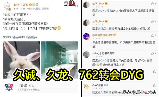 由于转会尚未官方宣布,所以这些爆料的媒体,都是用打哑谜的方式透露消息,和谍战剧一样,王处长消息的原话是我家的浴缸好用不?我家是大浴缸,我们一起在里面喝两杯酒没问题,是【我们】长长【久久】的意思吗。虽然看上去是简单的几句对话,但是里面信息量很多,大浴缸其实就是DYG的意思,而特别用【】备注的两个词,就是代表转会的三位选手,【我们】在英语里面就是WE,代表的是WE挂牌选手762,而【久久】代表的是Hero的两位选手,曾经久诚和久龙并称为久久组合。