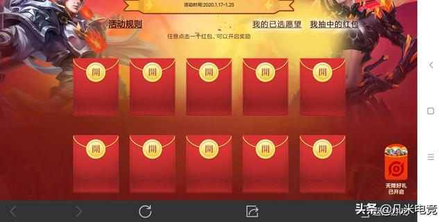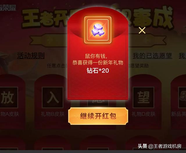 1月21号早上,王者荣耀进行的一次更新,而这一次更新也新出愿望红包,这一个活动主要是把自己心仪的4个皮肤放入到10个红包里面,只要把这10个红包抽完,肯定得到4个皮肤,而抽完10个红包需要200多块钱,但是我们拿200块钱去买4个皮肤都用不到200块,所以这一次天美在收割我们的智商。