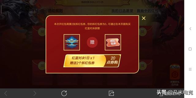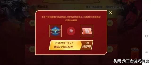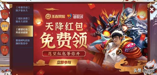 最近王者荣耀还有这样一个道聚城的所谓“天降红包免费领”的活动,其实也是套路多多,根本不是免费,需要你花钱的,而且花钱一般也就开出点皮肤碎片啥的,大家不要轻易上当就好。