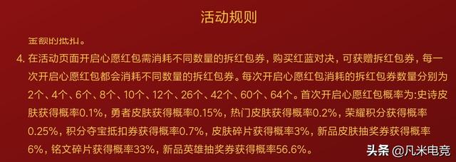如果你只是想碰个运气,开三四个红包就白嫖皮肤的话,请做梦去吧,天美肯定会把皮肤都安排在倒数要开的几个红包里面,而且没有任何意外。毕竟天美把开皮肤的概率放出来了,史诗皮肤的概率是0.1%,前7个红包能开到史诗皮肤的概率跟你刷荣耀水晶是一个概率!