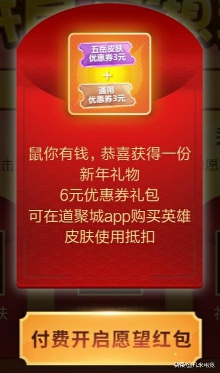 忍住继续开了两次红包!一次是铭文碎片30个和6元优惠券,这个优惠券还得去道聚城APP消费抵扣! 三次免费红包开启后出现付费开启愿望红包。