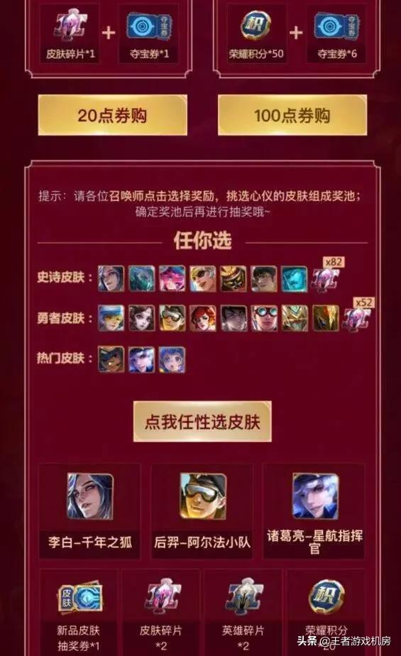 当然没有那么简单,但是活动大致和微信“摇心愿”活动相似,活动中可添加4个愿望池ABCD的,奖池分别有几款比较不错的皮肤,不过都是史诗级皮肤,而在玩家选择后并不能直接开奖 ,而需要支付点券才可以抽奖,是不是觉得很坑?