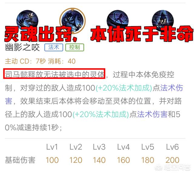 - 一技能,使用过后灵魂出窍,玩家玩的很爽,不过本体还在原地挨打呢,死的不要太快