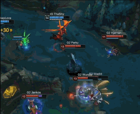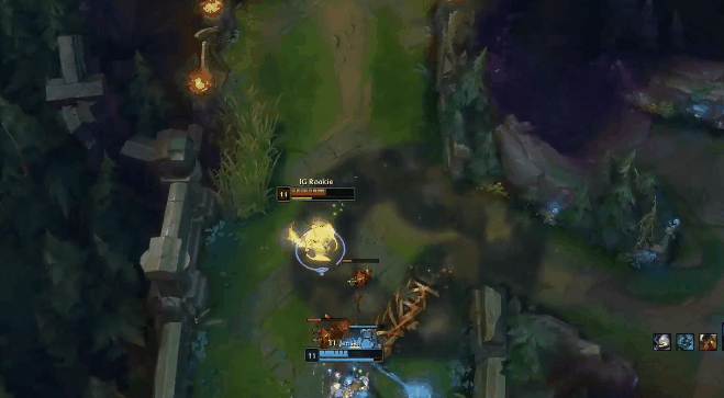 ig vs jdg,the shy操刀卡蜜尔野区偷红遭遇clid(现在skt打野)螳螂,被螳螂一套打至半血,卡蜜尔利用e钩锁拉开距离,螳螂穷追不舍。