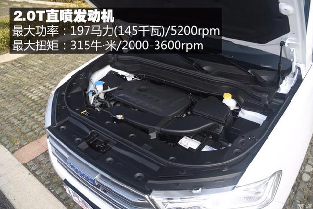 2.0T直喷发动机,最大功率197马力(145千瓦)/5200rpm , 最大扭矩315牛•米/2000-3600rpm。