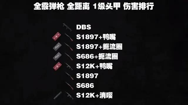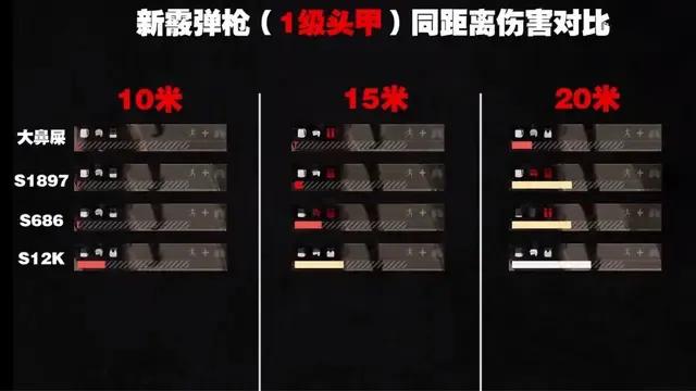 实际测试中10米、15米和20米的距离下,每把枪打3枪一级头甲的伤害量取一个平均值,伤害由高到低DBS>S1897>S686>S12K。