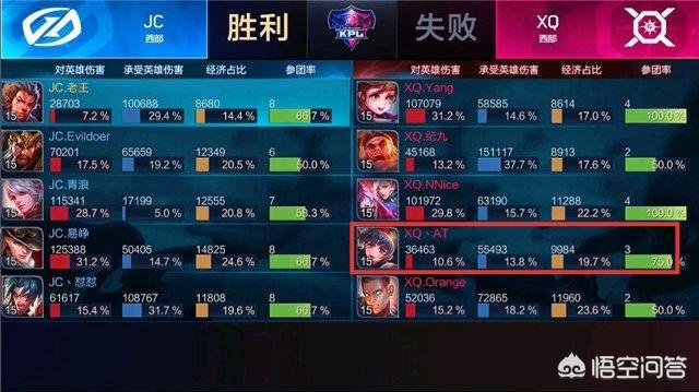 框选部分可以看到,初晨的公孙离输出占比仅仅13.2%,全队输出排名最末,输出26428,也是全场最低输出。那么,我们可以思考一下,顶尖KPL联赛选手的水平不够高吗?自然不是!初晨打野不厉害吗?很强!为什么输出这么低呢?输出环境被限制得太惨,不敢进场,老夫子的捆绑,东皇太一的大招咬,张良的大招拴,这都让公孙离的输出空间大幅缩减,又是逆风情况下打不出伤害自是难免的了!类似的是,也有XQ对阵JC,XQ阿泰的娜可露露输出占比也是很低的,这倒是因为被百里守约限制的太惨,视野被压制,位置提前布局,娜可露露没进场或许就被狙了一枪,关羽再一刀劈也就没了,输出环境并不是很好。