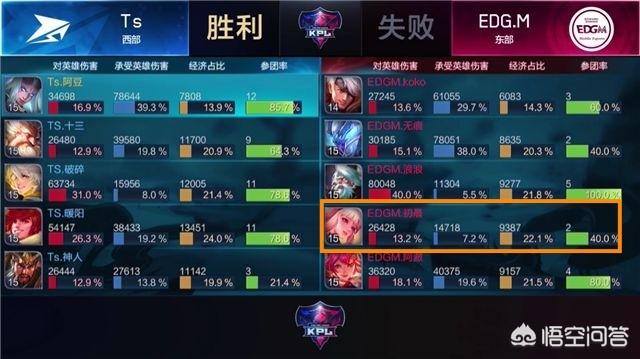 那么即使高段位玩家使用一些伤害能力较为的英雄,能打出全队较高比例伤害也不是绝对的。举几个例子吧,如下图所示为KPL秋季赛第一周EDG.M对阵TS战队第4局的比赛赛后数据图。