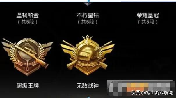 7大段:热血青铜、不屈白银、英勇黄金、坚韧铂金、不朽星钻、荣耀皇冠、以上每个大段位均分为5个小段位。超级王牌。无敌战神:达到超级王牌段位后,并达到全服排名前500的玩家。该段位每天零点更新。