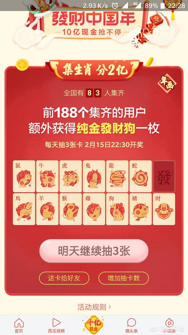 与此同时,今日头条横空出现,占据了抢钱系列的半壁江山。从刚开始的直播答题,到问答红包,再到生肖卡,人气一路飙升。不出意外的话,所有看到这里的人都在愁发字卡吧。相对来说,我很赞成今日头条的玩法,先让一部分人获得大奖(金狗),再让大部分人获得小奖。这个解决方案不得不说很圆滑,也达到了推广的目的,又让网友有钱领,相安无事,也不用挨骂。所以,现在网友参与度最高的还是今日头条的抢红包和集卡。
