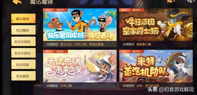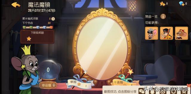 第三种办法:当然就是通过星星去抽取魔法魔镜中的皮肤。也可以用金币抽取奇幻魔镜中的皮肤(不过初音的奇幻魔镜还没抽到过,大部分都是魔法魔镜。建议大家抽魔法魔镜哦!),抽的皮肤的华丽度取决于幸运值。而幸运只有取决于你所抽的次数。简而言之,你抽的次数越多,你获得了皮肤就越高级,猫和老鼠每一个新皮肤上线,也会为大家送出星星。心动不如行动,大家也去抽一抽吧!祝大家能抽中一个s皮!