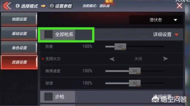最后是“武器设置”,同样是在保卫方开启“无限火力”,即你拥有无限的子弹数量;之后对潜伏者的改动是关闭全部枪系,这样所有的潜伏就只能拿个小刀啦。