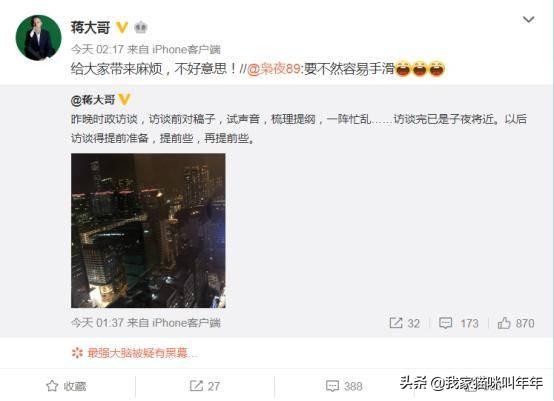 节目主持人蒋昌建教授点赞鲍橒,虽然此举上了热搜之后他取消点赞并在凌晨致歉,但蒋老师在此事中的立场却是显而易见的。只是他作为一个节目主持人,不应该在这个时候公开支持某一方。