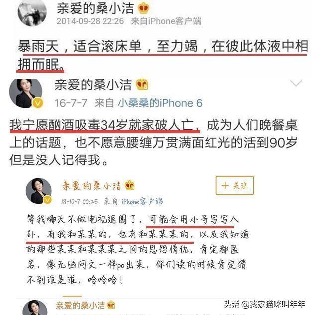 桑洁的微博就像一个三教九流混居的大杂院,污秽不堪。里面有“得人钱财,替人消灾”的“职业道德”,有不顾原则为节目吸引流量的价值观,更多的是“滚床单”和“爱爱”的宣言。