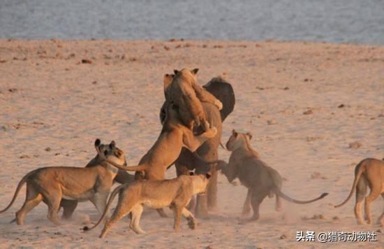 为什么是20头狮子就是这个道理,狮子可以分为两拨,一波10头进行围攻,当然前提是狮子不顾生死,两拨乱换着攻击大象,直到把大象的体力耗尽,由最后还活着的狮子上去一口结束躺在地上大象。