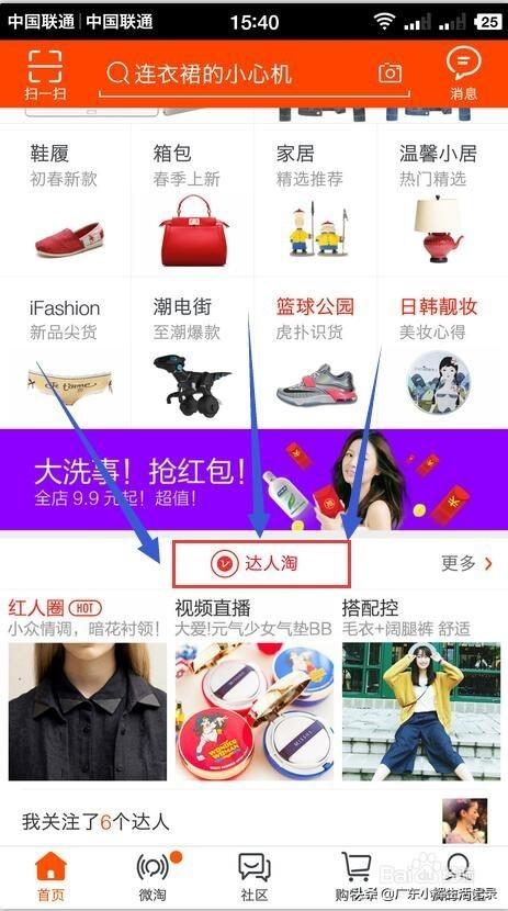 打开手机淘宝客户端,拉到最下面,有一个达人淘,在达人淘下面有一个红人圈,点击进入。