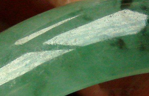 虽然B+C货看起来很漂亮,水头又好,但是行家会发现:不仅外表有酸蚀纹,而且颜色也不正,很多时候,C货颜色会随着翡翠的纹理渗透成网状而且有颜料沉淀。虽然最新的加工技术可以没有网纹和颜料沉淀,但是仔细看,颜色和底子都不自然,跟真正的翡翠色彩还是有差别的。