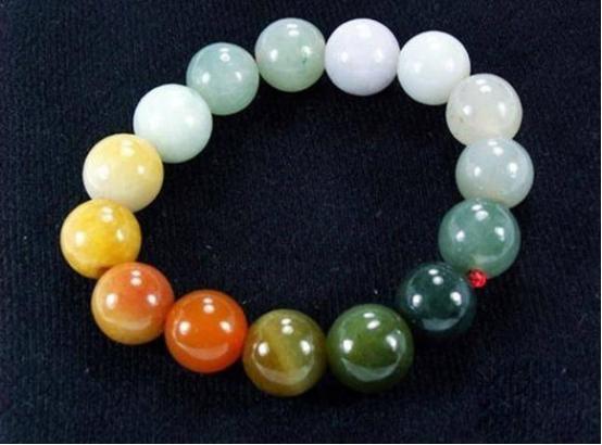 真正的A货翡翠,虽然色彩丰富艳丽,但相对人工染色又保守多了,不会有过于鲜艳的颜色,这里给大家一个可以做日常色谱使用的翡翠手串,看看日常可见的翡翠颜色一般是怎样的