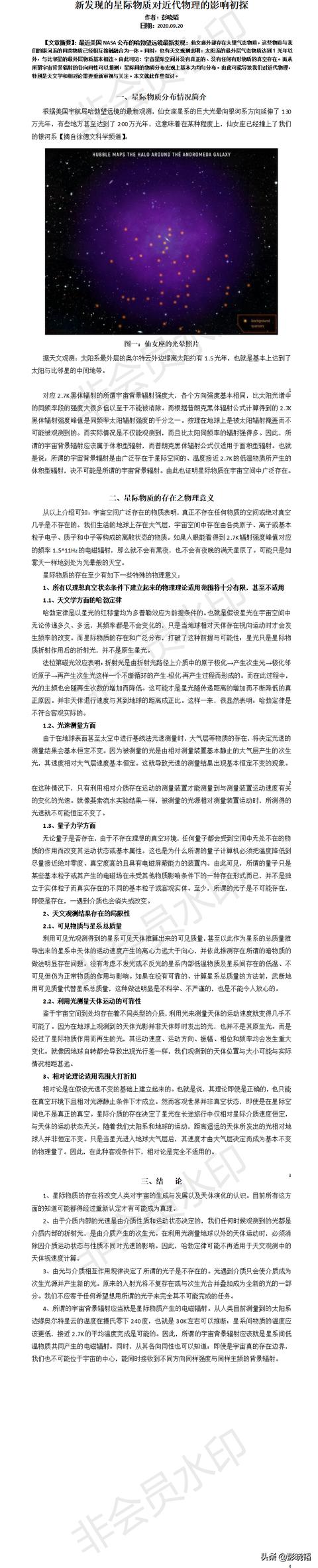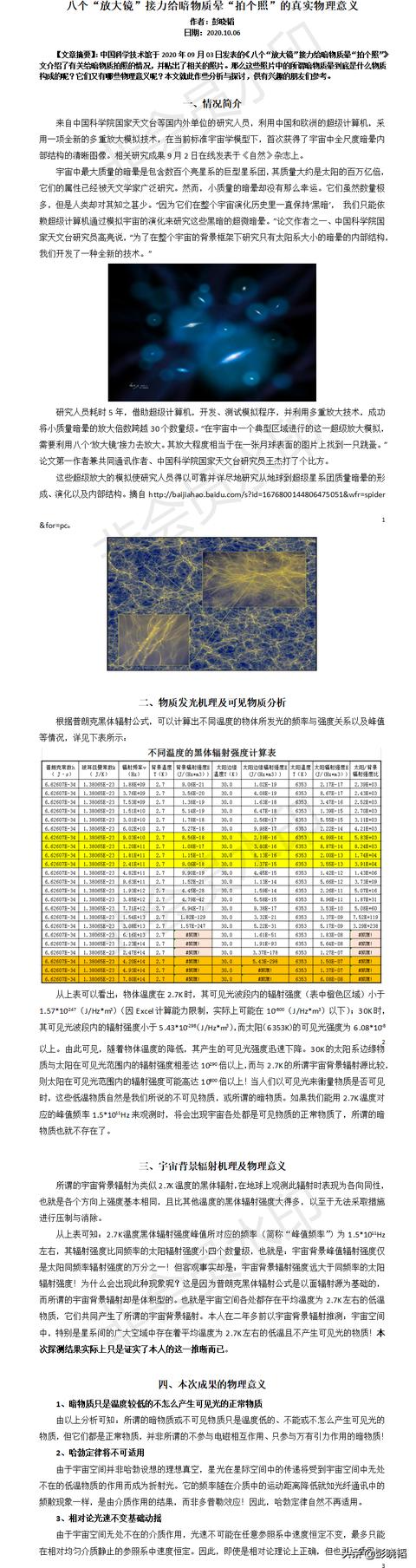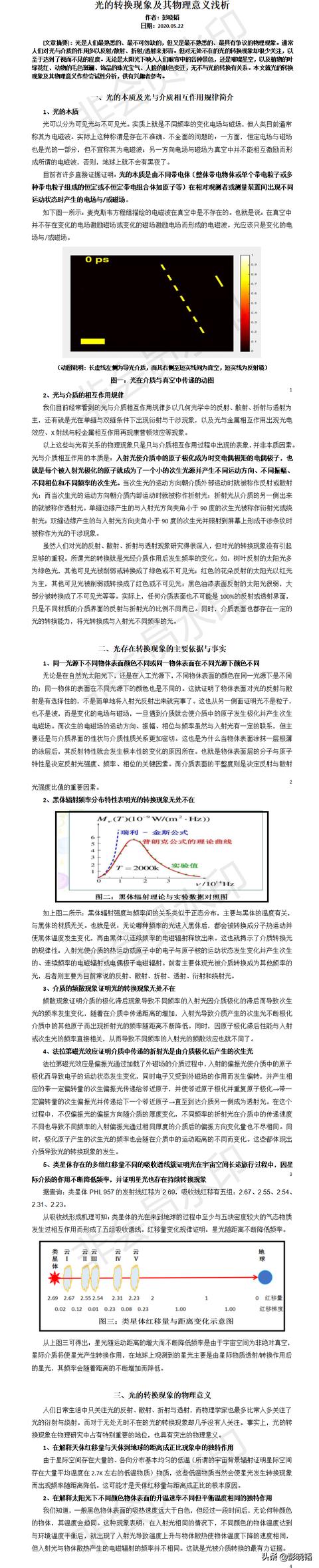 一、认为天体红移量与天体到地球的距离成正比是因为天体退行而产生的多普勒效应的说法可能并不符合客观实际。因为天体间的广大区域均存在各类介质,它们可能会使星光随距离不断降低频率。就像光纤通讯中的光信号会随传递距离降低主频一样。本人设计了一种方法可用来查明决定天体红移量主因到底是视速度还是视距离,并顺便检验一下哈勃定律的正确性。此方法已经专家们审核并发表在由中科院主办、中科协协办的“科学智慧火花”网上了,应该是一个可靠和可行的方案,希望国内天文工作者能早日进行此方面的研究工作;