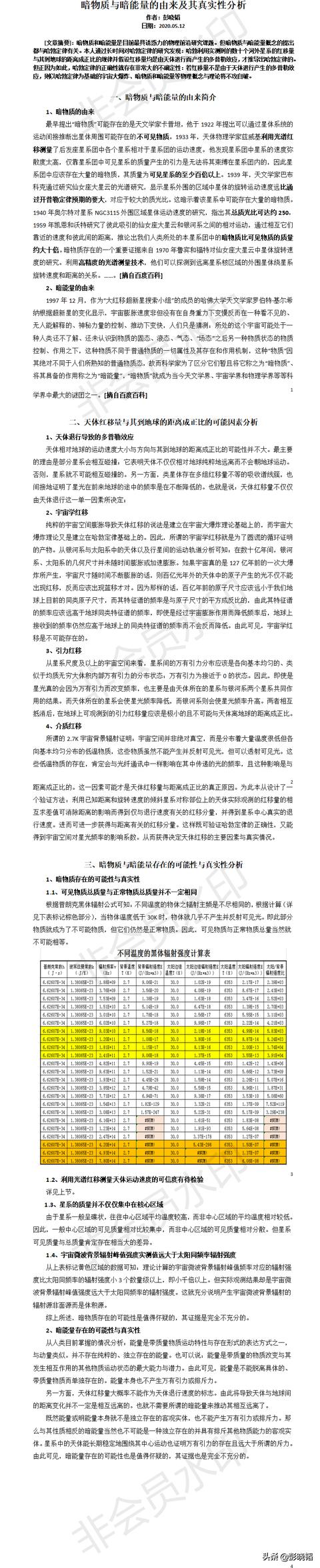 三、就能量本身而言。如果说存在暗能量,那么与暗能量相反的应该称其为明能量或正能量吧。目前可能还没有人能说清楚明能量或正能量到底是什么。因为能量本来就只是带质量的物质运动特性和所处空间位置特性的表达方式之一,与动量类似。客观上,并不存在纯粹和、独立存在的能量。因此,既然暗能量的对立面明能量或正能量就不是独立存在的客观实体,那么所谓的暗能量更是虚无飘渺的东西了。