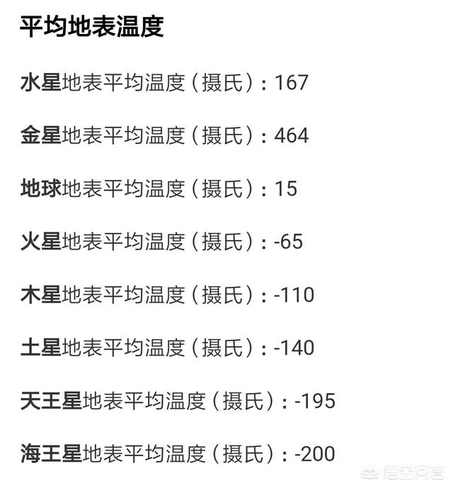 宇宙空间中的最低温度约270℃。要是没有太阳,所有星球都会变得极度寒冷。离太阳距离越远的星球,其表面温度越低,木星、土星、天王星和海王星的表面最高温度都在零下100摄氏度以下。火星赤道表面白天最高温度可达20℃以上,而到夜间就降到-80℃以下了。