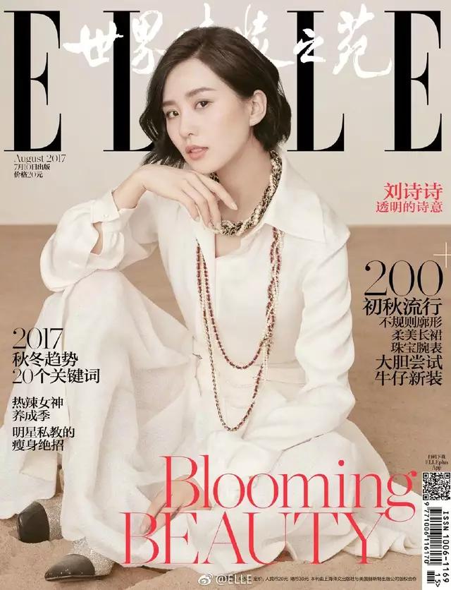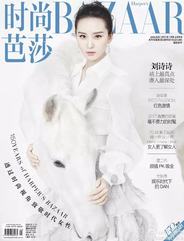 刘诗诗: 17年第一重惊喜,来自首次解锁《时尚芭莎》。诗诗将长发束起,化身“爱莉诗”游历仙境,身骑白马,细嗅蔷薇,释放出她心底最温暖又最有力量的一面。可能与毕业与北京舞蹈学院,从小习得舞蹈的原因有关,诗诗打小带有一种清新脱俗的气质,眉宇间若有似无的笑意,眼神诚挚清澈。封面服装来自于Chanel 2017早春系列。