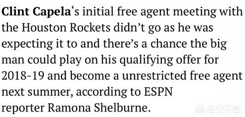 早些时候ESPN名记蕾梦娜-谢尔伯恩表示过,卡佩拉跟火箭的会面并不愉快,他没有达到心里预期,也就是说火箭队并没有出更高的价格,而且自由市场上也没有球队愿意给卡佩拉更高的薪水,卡佩拉很可能接受470万的资质报价再明夏成为自由球员试水自由市场。若马刺愿意达成这笔交易,火箭就能给卡佩拉两年(1+1)1500万的年薪,这样卡佩拉就没有资质报价里的交易否决权,卡佩拉也能在明夏跳出合同继续寻求更大的合同,这笔报价比470万高,而且也能在明夏试水自由市场,他去了马刺就能成为先发中锋,若表现优异,明显马刺队就可能给他一份大合同。