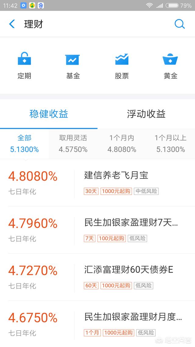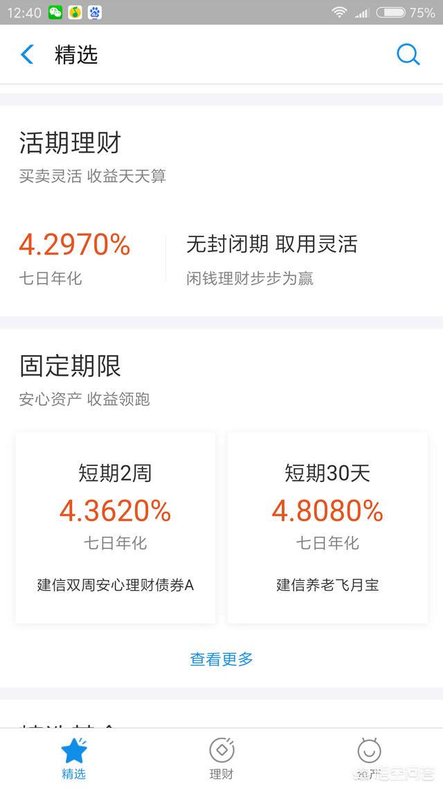 让我们看看支付宝里理财产品种类:打开支付宝软件,从我的>蚂蚁财富进去,会看到有活期,定期(短则7天,30天,60天等),各类基金等。里面各品种都有标注说明,一看就明,需要说明的是,除余额宝外,支付宝内其它活期产品利率比余额宝稍高,也存取灵活自由,无封闭期,但要经过买卖两道程序,买之后第二天产生收益,卖之后第二天才能到账提现,比余额宝稍显不便;定期类分各短、中、长时期分别不同利率,清楚明了,用户根据自身需要选择,最后是浮动收益类基金产品,除债券类基金相对收益波动不大外,其它如股票类或混合型基金等虽是专业人士打理,其主要投资标的为股票等证券产品,收益波动比较大,不保证正收益,盈亏皆有可能,风险较高,如果追求高风险高收益,不妨规划将自有财富之10~20%作中长期投资理财打算,最好选择定投,按一定周期坚持小额定投,平滑短期波动风险,根据自己风险偏好,选择经过长时期考验(五年及以上)的稳健型基金,坚持下去,会有相对不错的收益。