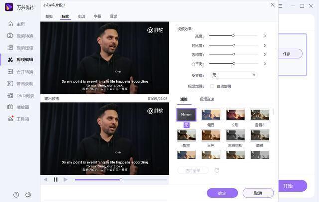 万兴优转提供了多种特殊效果模板供你选择使用,同时你可以对视频的色彩和亮度等因素进行自定义调节。