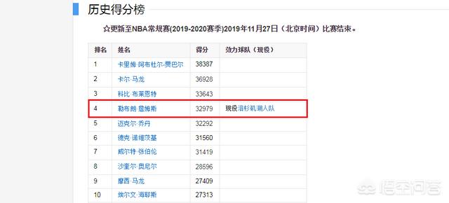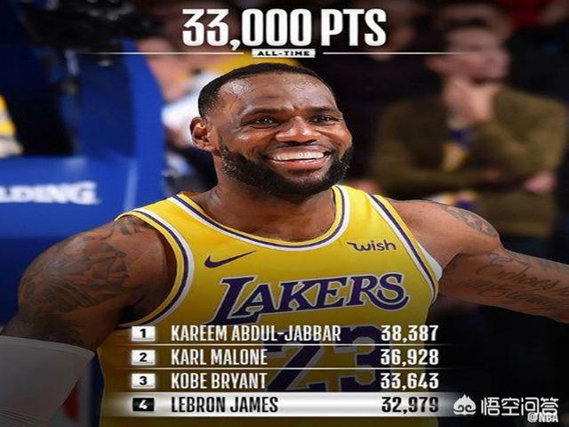 目前詹姆斯的总得分大概在33000分左右,这个是没有计算季后赛的,排在他前面的有三个球员,分别是科比、马龙和贾巴尔。
