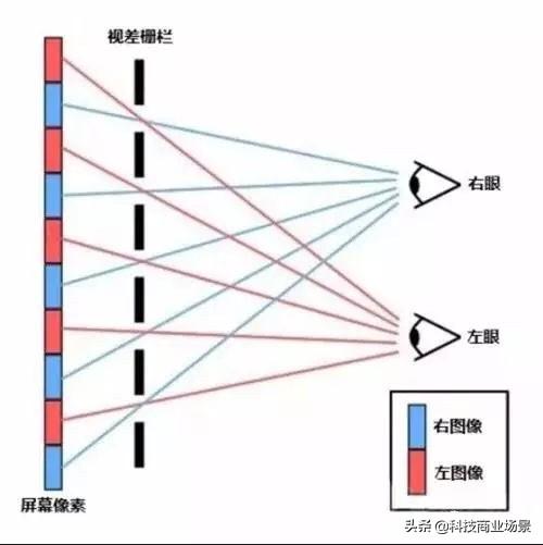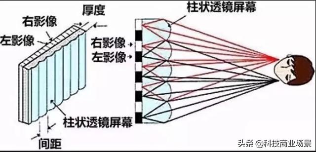 同时大脑将映入双眼的两幅具有视差的图像通过视神经中枢的融合反射,以及视觉心理反应从而形成三维立体感觉。而裸眼3D技术在这个基础上通过光栅或透镜将显示器显示的图像进行分光,从而使人眼接收到不同的图像,这样便实现了3D显示。狭缝光栅显示器通过在显示面板前方放置一个参数合适的狭缝,对显示的内容进行遮挡,在经过一定距离后,到达人眼的光线便可被分开,双眼接收到两幅含有视差的图像。下图 中人眼就能分别看到蓝色和绿色,这样就能产生立体效果。柱状透镜式采用了相同的原理,只是实现的方式由狭缝换成了透镜,透镜通过对光的折射作用,将不同的显示内容折射到空间中不同的地方,到达人眼时显示的内容被分开,人眼接收到两幅含有视差的图像,这样便产生了立体效果,因而,裸眼立体显示仍基于立体视觉原理,只是通过改进立体显示器,以特定光学遮挡和光路传播控制的方式,实现将含有视差的图像分别传送到我们的左右眼睛,进而观看到立体影像。