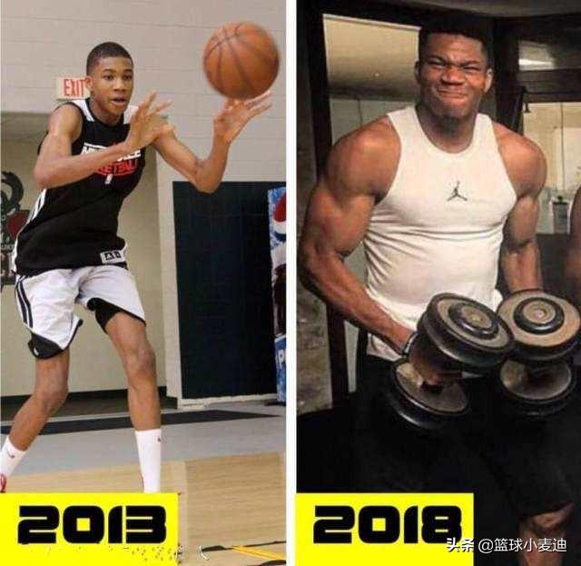 2、字母哥,刚进联盟时候瘦得跟竹竿是的,全身没有一点肌肉,加上青涩的脸庞,一度怀疑在NBA打不出来。几年以后,有点像美国队长那样,由一个弱不禁风的瘦子变成一肌肉男。当然出众的身体素质也给他带来了一座MVP奖杯。