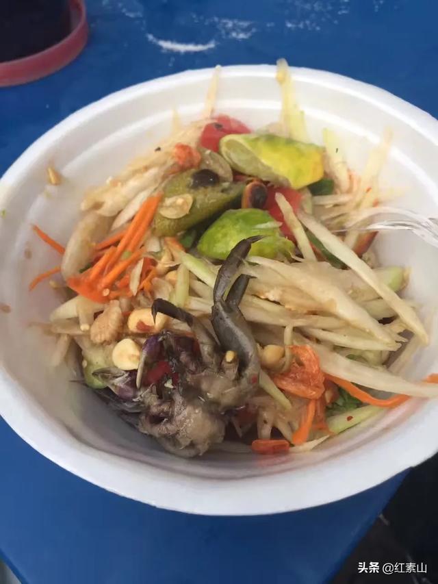 首先跳出脑海的必须是凉拌青木瓜丝,几个城市都有,但我更钟爱曼谷市中心一条背街上的那个味!凉拌青木瓜丝,听来卖的当地人读“Pa Pa Ya ”,这东西真是我的大爱啊[色]看图上,各种调料那叫一个丰富,我能叫上名的有柠檬、花生、胡萝卜、核桃、重点看那个小螃蟹,有点重口味的[得意]可以选择辣的和不辣的,果断选择辣的,就看店家往里面倒入各种液体状调料,我猜可能是鱼露,再配上干的粉状调料,一股脑或进去后就用那根粗粗的木棍舂,捣哧几下后就装进了小碗里,那动作麻利、流畅味道嘛,酸、甜、咸、鲜、辣都混在一起,在30多度的高温天气里非常的爽口消暑!只一次我就爱上了泰国的凉拌青木瓜丝,每逢亲朋好友准备去泰国或是要吃泰菜,都极力推荐。在普吉岛和清迈也尝了当地的凉拌青木瓜丝,和曼谷吃的还是有差别的,普吉岛的调料没有那么丰富,口感层次上也不及;清迈的整体口感偏甜,不如曼谷的清新,也或许是因为先入为主的印象太深刻了吧,我竟然会以加不加小螃蟹来判断这道菜是不是地道,有点偏执了[我想静静]无论怎样,我心里这道小吃绝对是最有泰国味的,没有之一!