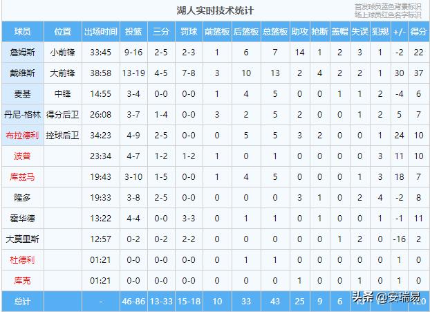 以下是湖人球员的本场的数据统计: