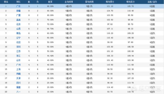 广东队9胜1付位列积分榜第一位,八一队1胜9付位列积分榜最后一位。都是拜吉林队所赐。