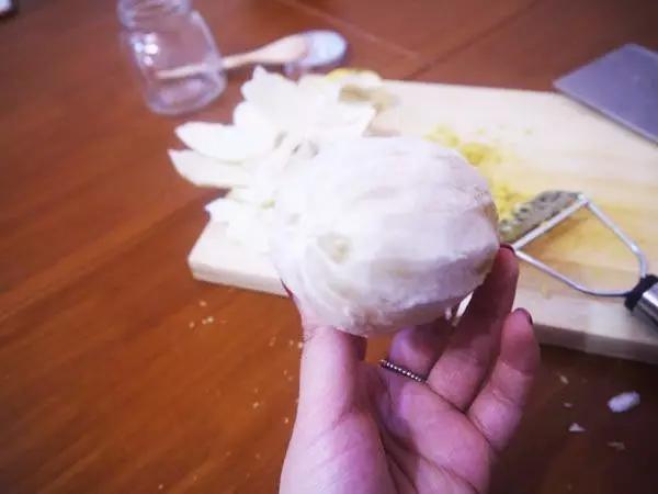 值得注意的是,这是一个失败的柠檬,那层白皮太厚了,正常柠檬的那层皮是很薄的,用手撕就行,而这个柠檬,点妹儿是用刀削的,如图,正是削去中间白皮的柠檬↓
