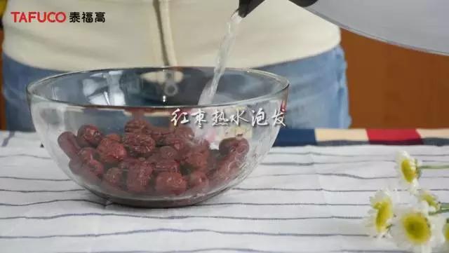 第一步:处理食材首先,我们先将洗净的红枣用热水泡发,大概一小时左右。