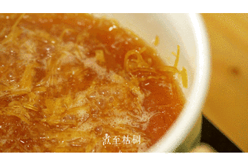 (4)将柚子果肉,细丝,100克冰糖,放入少许的清水中用大火烧开,再转小火熬制1个小时。注意:时不时翻动一下