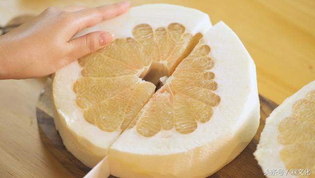(2) 后把柚子的果肉撕成碎片放入盘中备用。