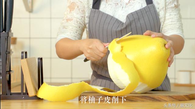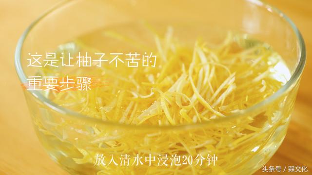 (1)柚子皮洗净,削皮,切细丝,放淡盐水中泡1个小时左右。