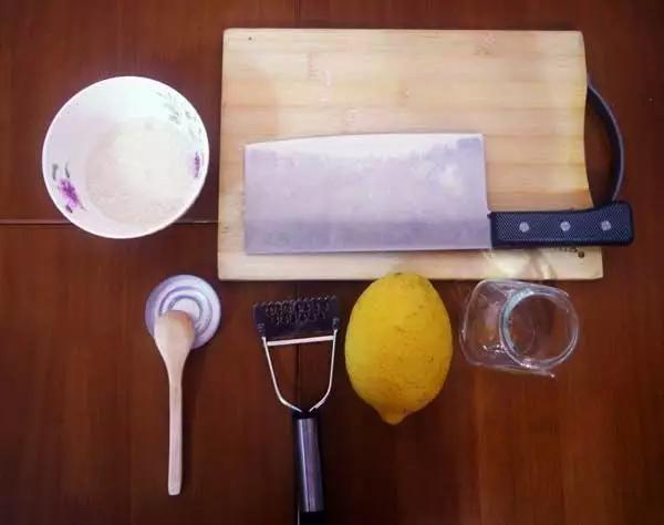 1个有盖子的玻璃杯(玻璃杯内部必须要是干的,可以晾干也可以用纸擦干)、1个柠檬(你也可以做2个、3个、4个……)、菜板、菜刀、适量白糖、勺子、削皮器↓