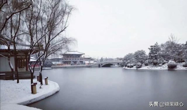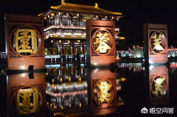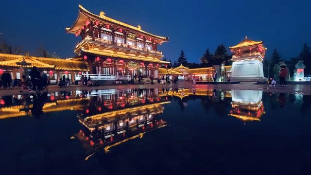 3.周五晚上选择的都是夜景突出景点,大唐芙蓉园内一般,主要是游船表演,但天气太冷,可以根据实际情况放弃进园。门口贴心的设置了水面,方便游客拍摄倒影,详情可以见图,喷泉是八点钟,可从大唐不夜城游览过去。