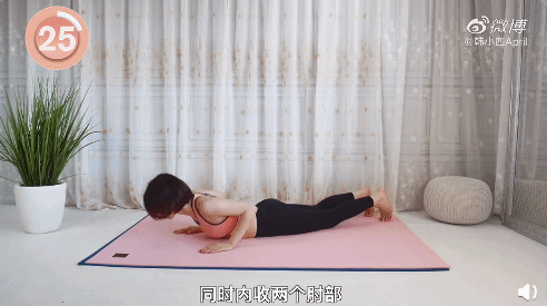 (9)手放在胸部两侧,然后将上半身撑起,之后回到原位。身体下落时,要注意内收肩胛骨,练习30秒。