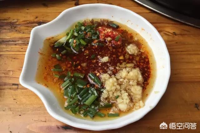 油碟长这样,还是比较有特色的,葱花儿、大头菜、小米辣、蒜泥、海椒面,要是再有点折耳根颗颗就更巴适了。
