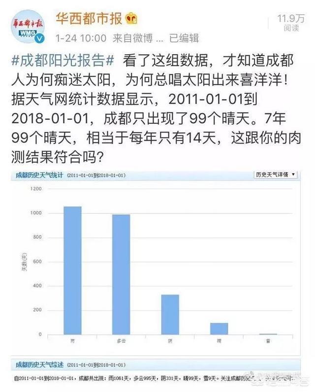 华西都市报昨天一条微博就说,据天气网统计数据显示,2011年到2018年的7年间,成都为“晴”的天气只有99天。平均下来,每年就14天……