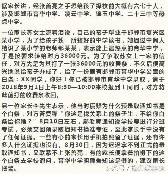 我们孩子也马上小升初了,也参加了里面涉及到的学校五升六的择校考试,无奈这种掐尖考试,我家孩子无缘。我也问过这种中间人,要价六万至多。这种要价在朋友圈都有发布,已不是秘密,只是给孩子造成了心理阴影。其实这里面还涉及到一个户口问题,我们户口在丛台区,随在邯山区居住十年之久,但是房屋一直无法办理产权证,户口迁不过来,我们又回不去。孩子只能面对各个学校的考试,不知是谁的悲哀……政府和媒体虽都在关注,可是只会让考试提前,别的作用也起不到……