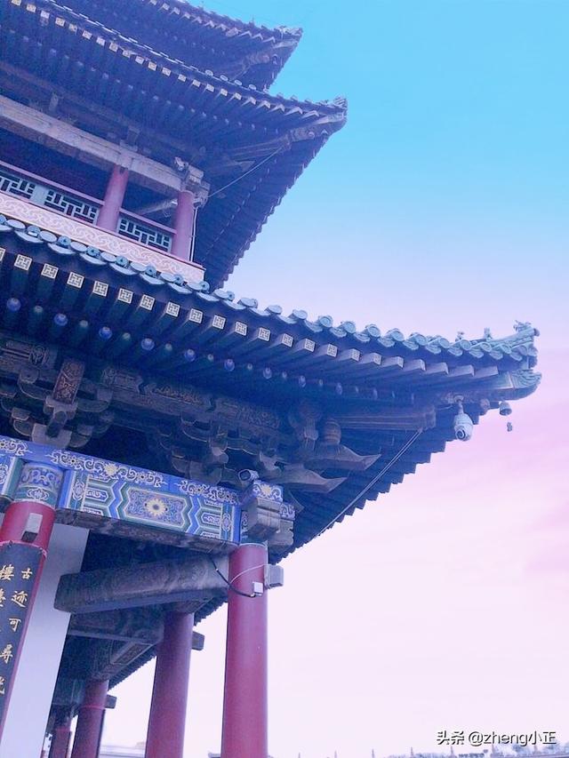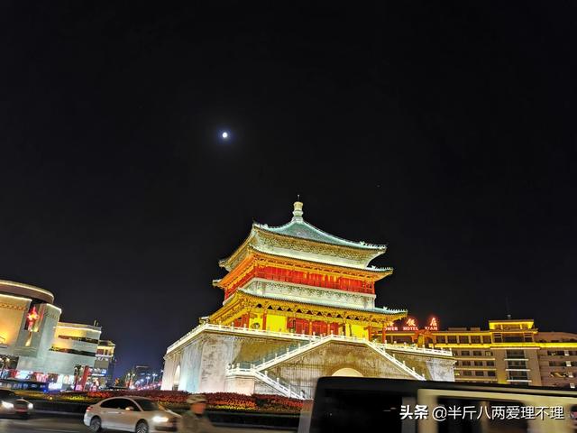 拍出建筑物的本貌,结合合适的光线。下面图是西安的钟楼,天空的月亮、古楼的夜景灯衬托着古建筑。